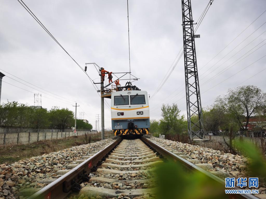 新疆铁路部门接触网工乘坐检修专用车辆对乌北站铁路接触网设备进行集中检修(4月22日摄)。新华社发(段亚楠 摄)