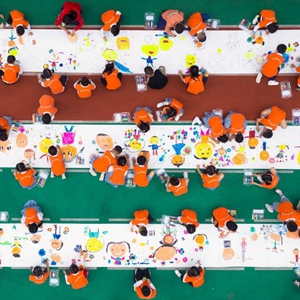 5月26日,重庆市北碚区实验幼儿园的孩子们在长卷上绘画(无人机照片)。当日,重庆市北碚区实验幼儿园开展“花儿朵朵向太阳 百米长卷映童心”主题绘画活动,孩子们用手中的画笔描绘成长中的点滴,为童年生活留下美好回忆。新华社发(秦廷富 摄)