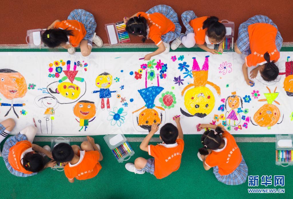 5月26日,重庆市北碚区实验幼儿园的孩子们在长卷上绘画(无人机照片)。当日,重庆市北碚区实验幼儿园开展“花儿朵朵向太阳 百米长卷映童心”主题绘画活动,孩子们用手中的画笔描绘成长中的点滴,为童年生活留下美好回忆。新华社发(秦廷富 摄)