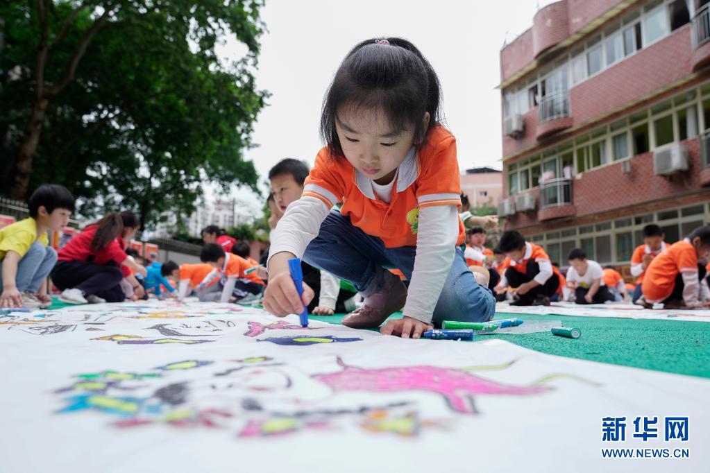 5月26日,重庆市北碚区实验幼儿园的孩子们在长卷上绘画。当日,重庆市北碚区实验幼儿园开展“花儿朵朵向太阳 百米长卷映童心”主题绘画活动,孩子们用手中的画笔描绘成长中的点滴,为童年生活留下美好回忆。新华社发(秦廷富 摄)