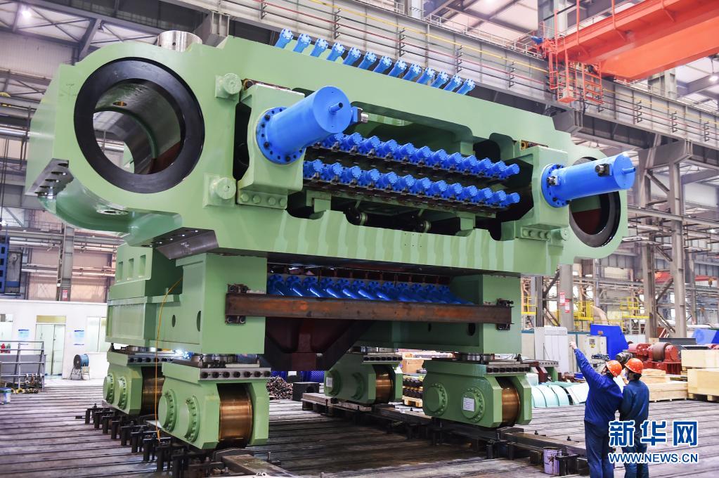 这是中信重工研制的具有国际先进水平的大型铝板125MN(兆牛)拉伸机核心部件——重达1200余吨的活动夹头(2021年3月1日摄)。