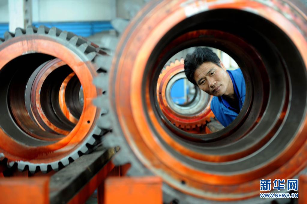 工作人员在河南洛阳中信重工生产车间查看大型矿用磨机(2010年8月25日摄)。