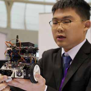 5月26日,来自西安交通大学的学生在介绍自己的毕业设计——智能跟随陪伴机器人。