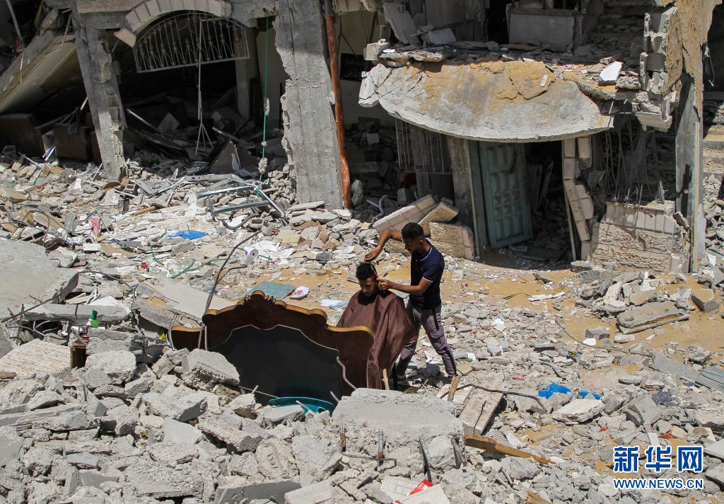 5月26日,在加沙地带北部的城镇贝特拉希亚,23岁的巴勒斯坦理发师阿卜杜拉·扎瓦拉在他被以色列炸毁的房屋前为顾客免费服务。 新华社发(里泽克·阿卜杜勒·贾瓦德摄)