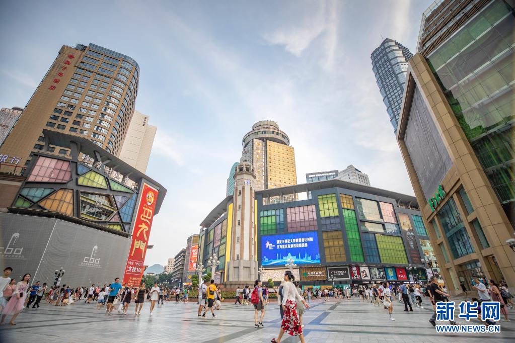 游客在重庆市渝中区解放碑步行街观光游玩(2019年8月20日摄)。