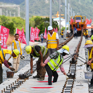 5月27日,中铁四局施工人员在深圳北站外铺设赣深铁路广东段南端大里程方向最后一对长轨。