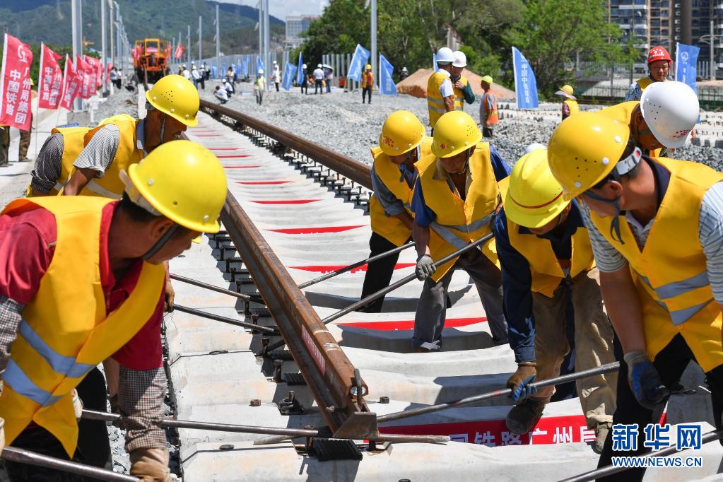 5月27日,中铁四局施工人员在深圳北站外铺设赣深铁路广东段南端大里程方向最后一对长轨。新华社记者 刘大伟 摄