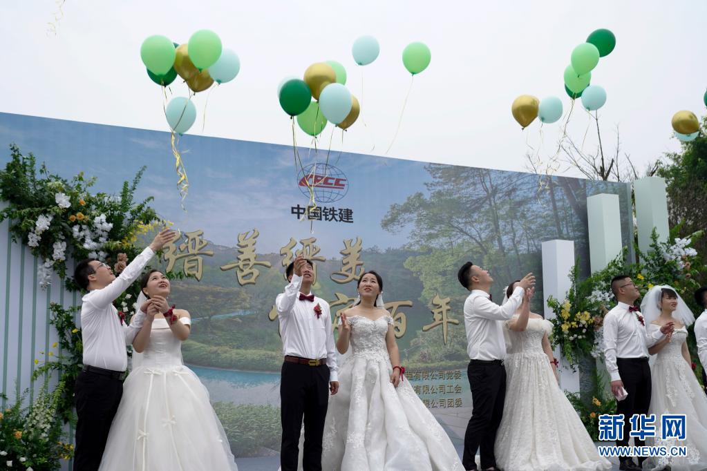 5月27日,在重庆市北碚区中铁二十二局五公司集体婚礼现场,新人放飞气球。