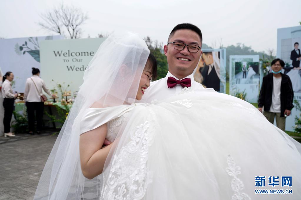 5月27日,在重庆市北碚区中铁二十二局五公司集体婚礼现场,一名新郎抱起新娘。