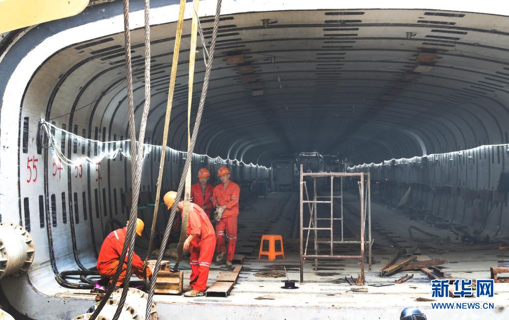5月27日,工程技术人员在上海地铁14号线静安寺站站厅层顶管工程入口端,对标有55号的最后一段管节进行顶管推进作业。