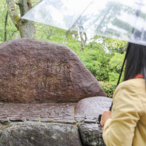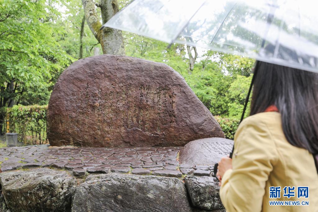 4月28日,在日本京都岚山,一名游客欣赏“周恩来总理纪念诗碑”。