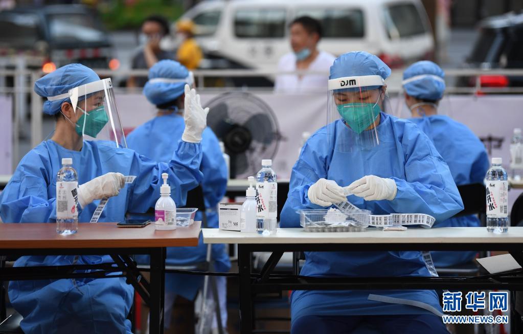 广州市荔湾区于5月26日至27日开展全员核酸检测。各级医务人员紧急响应,在各街道、社区检测点一线,冒着高温进行核酸检测工作。