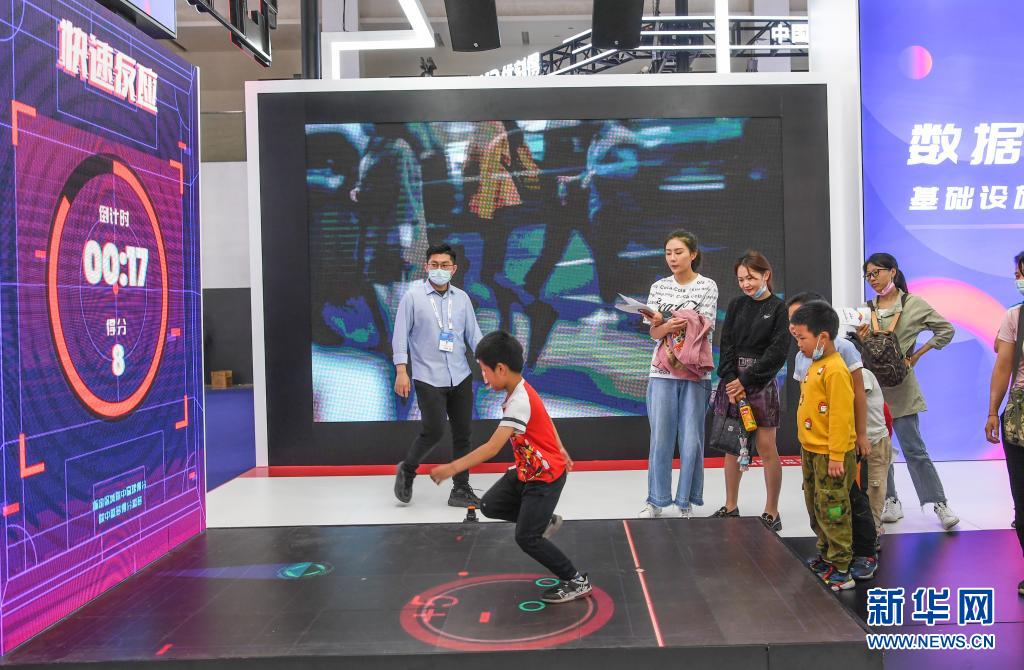 5月27日,小朋友在博览会上体验一款数据流通大作战游戏。