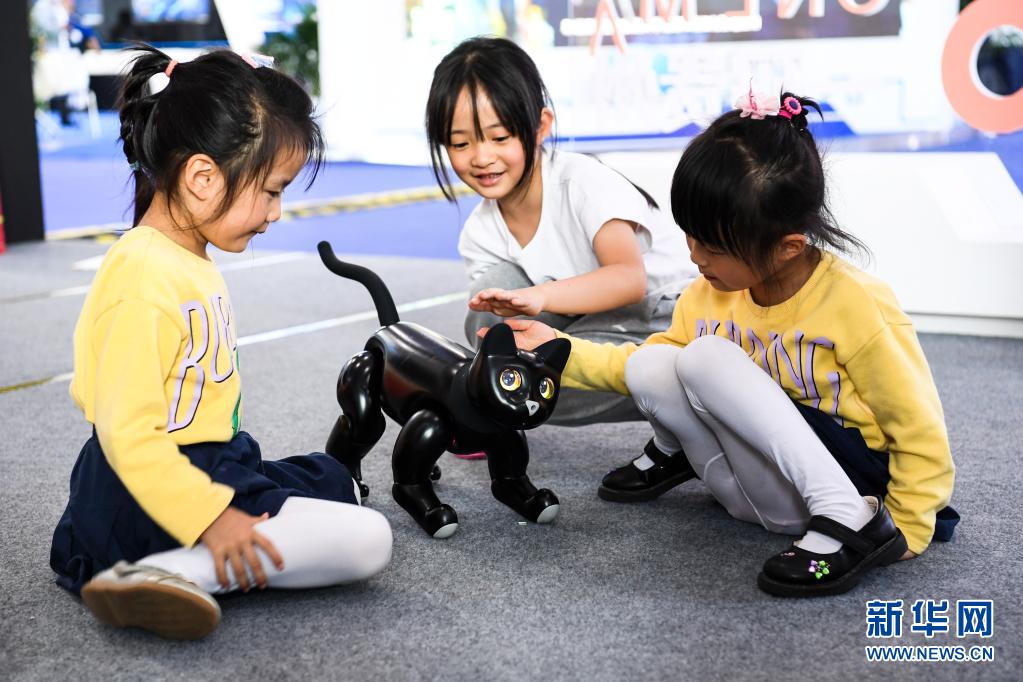 5月27日,孩子们在“数博会”上与一款AI仿生机器猫互动。