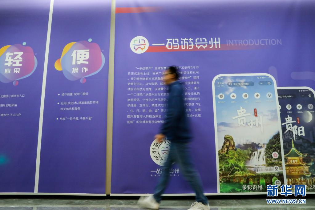 5月27日,工作人员从“一码游贵州”全域智慧旅游平台的宣传展板前经过。