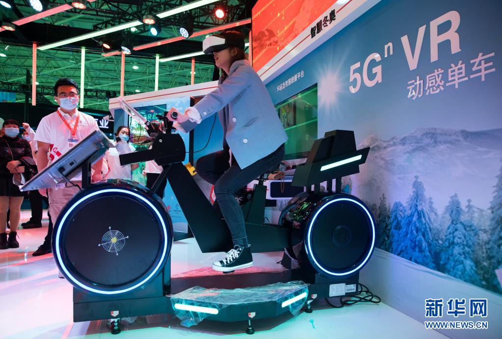 5月27日,在2021中国国际大数据产业博览会展馆,观众在体验5G虚拟现实动感单车。