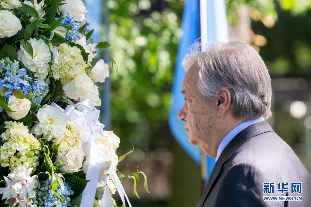 5月27日,在位于纽约的联合国总部,联合国秘书长古特雷斯向维和人员纪念碑敬献花圈。