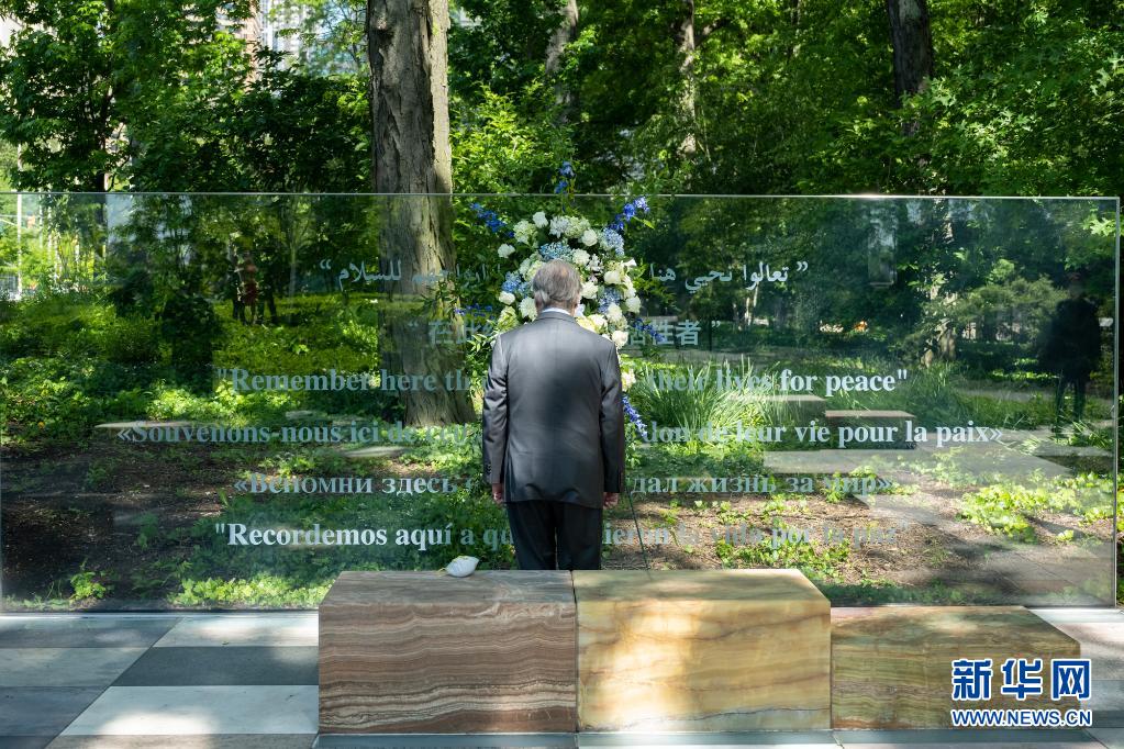 5月27日,在位于纽约的联合国总部,联合国秘书长古特雷斯向维和人员纪念碑敬献花圈。