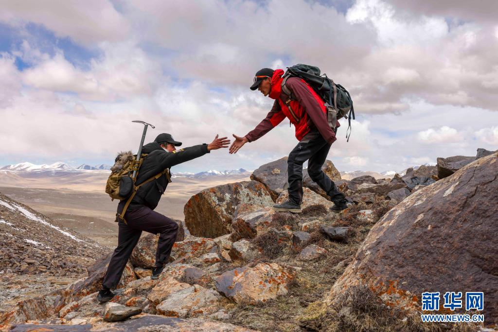 别克米尔扎·图尔达力(左)在同伴库尔班巴依·努尔麦麦提的帮助下跨过一段乱石密布的山路(5月16日摄)。新华社记者 胡虎虎 摄