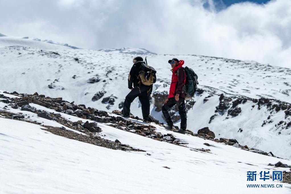 在当天的适应性训练中,别克米尔扎·图尔达力(左)和同伴库尔班巴依·努尔麦麦提行进在慕士塔格峰海拔约5000米的山路上(5月15日摄)。新华社记者 胡虎虎 摄