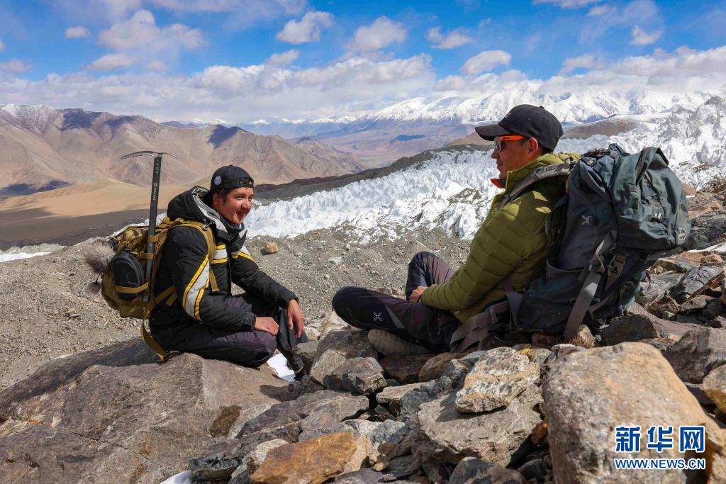 在慕士塔格峰海拔约4800米处,别克米尔扎·图尔达力(左)和同伴库尔班巴依·努尔麦麦提休息聊天(5月15日摄)。新华社记者 胡虎虎 摄