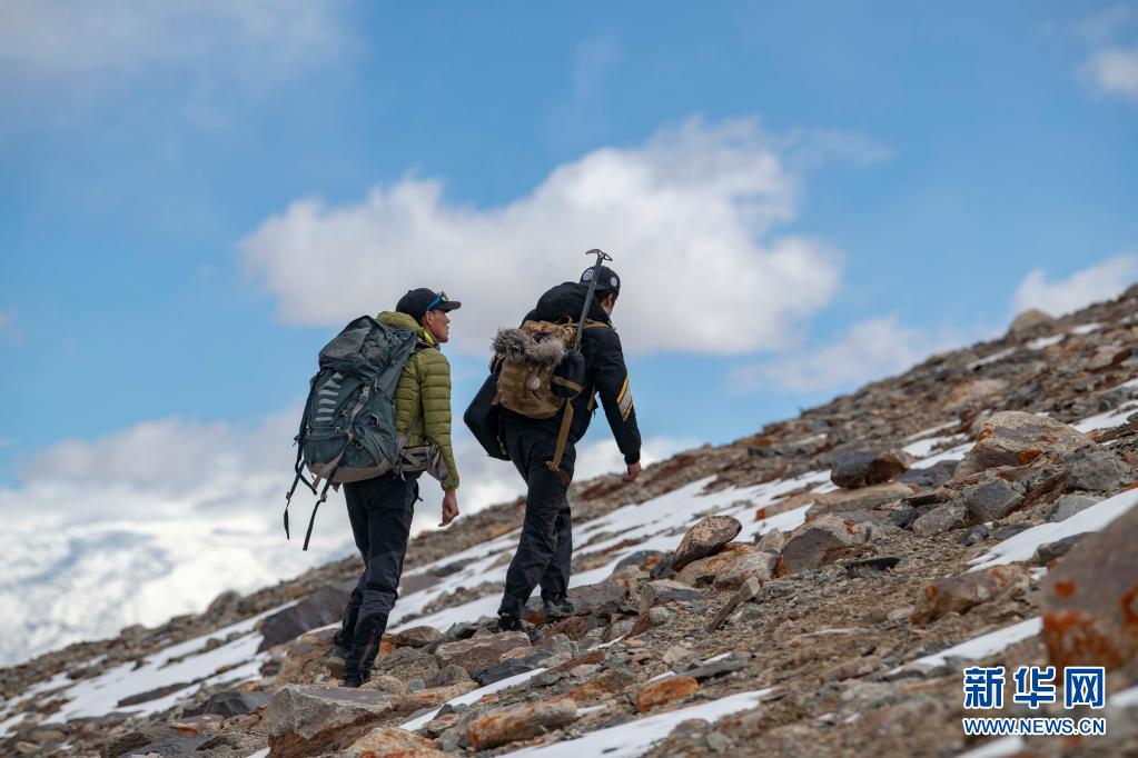 别克米尔扎·图尔达力(右)和同伴库尔班巴依·努尔麦麦提在进行适应性练习(5月15日摄)。新华社记者 胡虎虎 摄