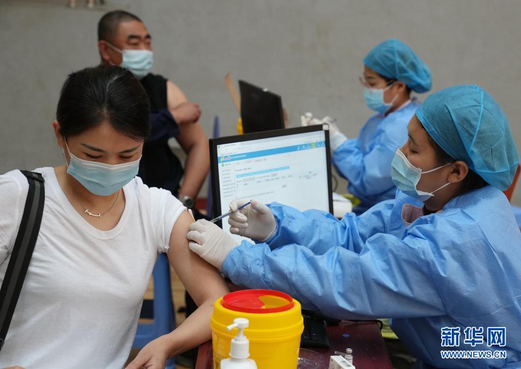 5月28日,在唐山市海港经济开发区体育馆新冠疫苗接种点,医务人员在给市民接种新冠疫苗。