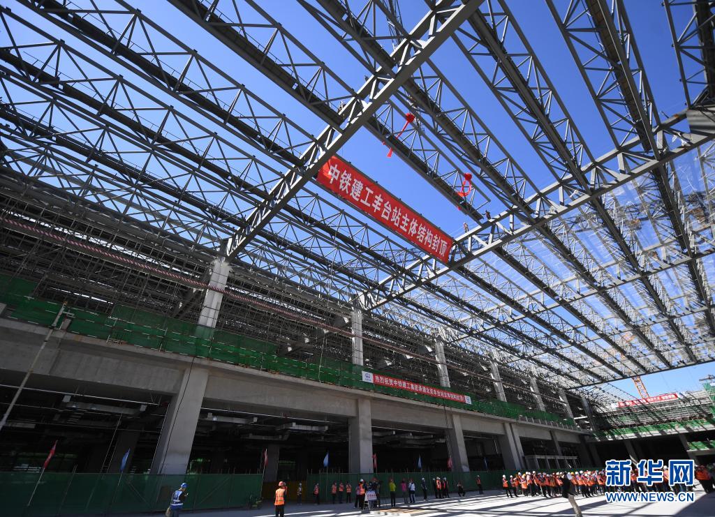 北京丰台站主体结构封顶施工现场(5月28日摄)。