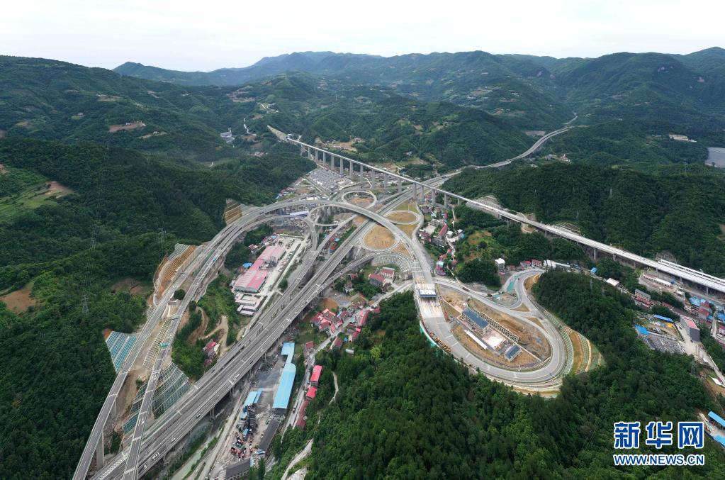 5月28日在湖北省襄阳市保康县后坪镇拍摄的保神高速公路、呼北高速公路交会处的后坪互通枢纽(无人机照片)。