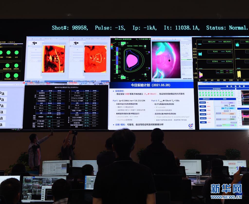 5月28日凌晨,在全超导托卡马克核聚变实验装置(EAST)控制大厅,屏幕显示1.2亿摄氏度等离子体运行突破100秒的瞬间。新华社记者 周牧 摄
