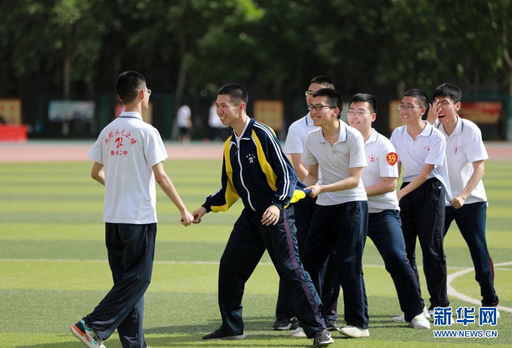 5月28日,河北省衡水市第二中学高三学生在操场上参加趣味减压活动。