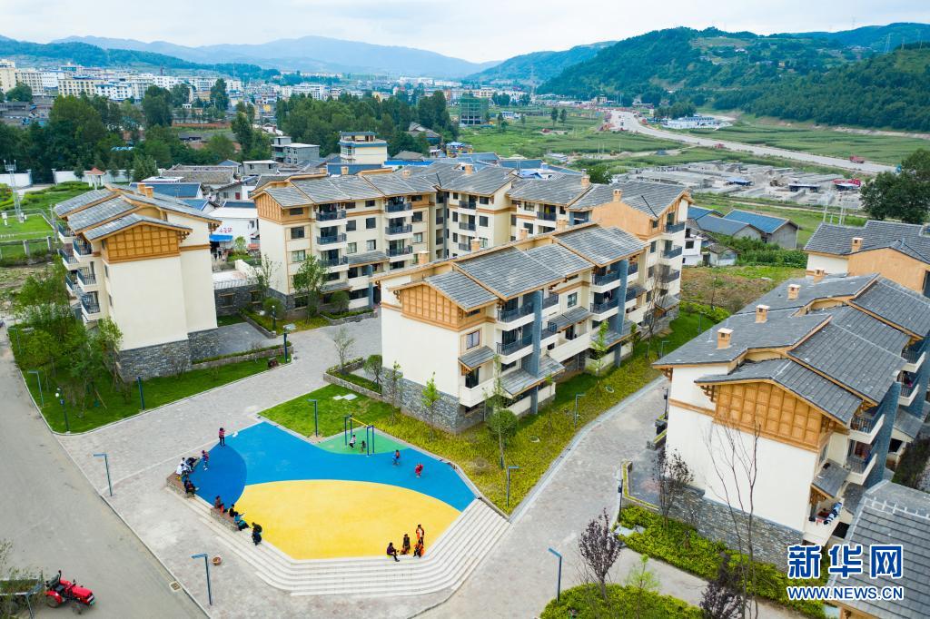 在四川省凉山彝族自治州昭觉县的易地扶贫搬迁安置点南坪社区,居民在社区公共广场上休闲(2020年8月12日,无人机照片)。新华社记者 沈伯韩 摄
