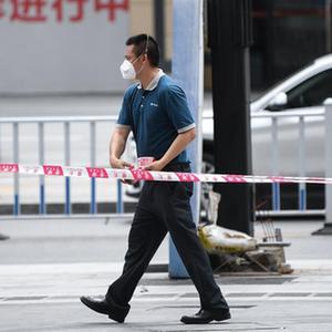 5月29日,在广州荔湾区白鹤洞街广钢新城街道,物业工作人员拉起安全警戒线。