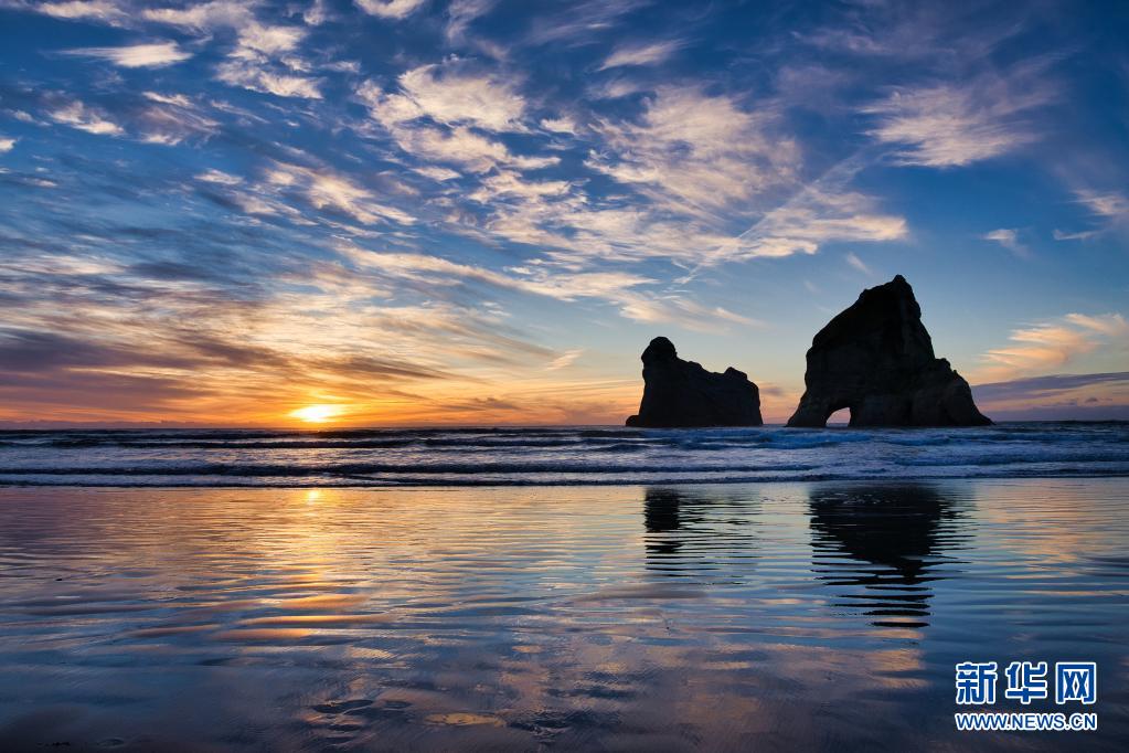 这是5月23日拍摄的日落时分的新西兰黄金湾华拉里基海滩,此地的两块岛礁被当地人称为“拱门岛”。