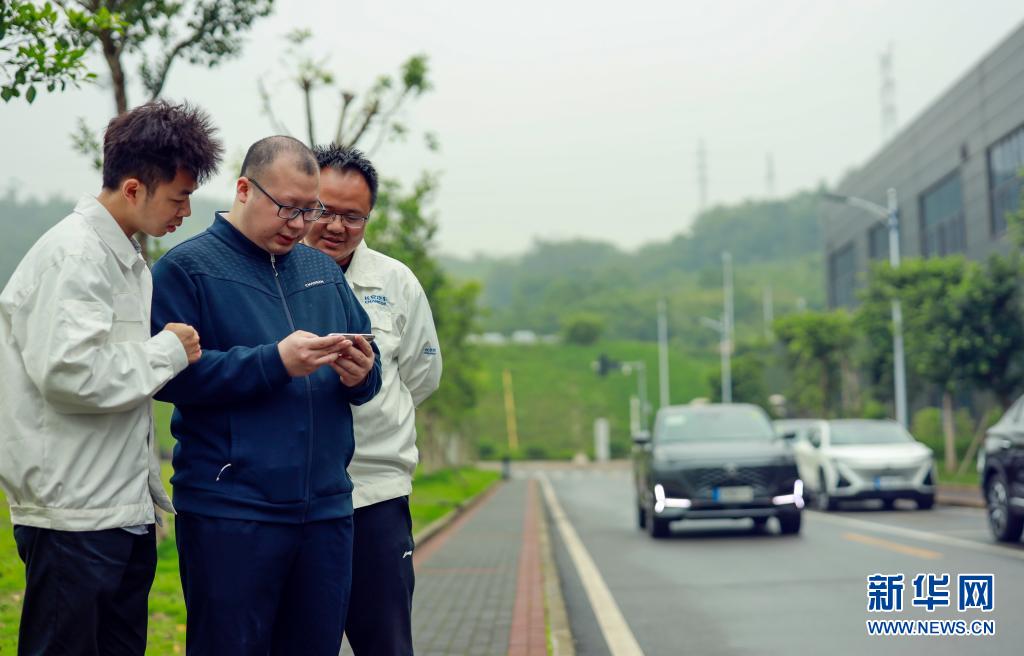 5月27日,在重庆两江新区长安汽车全球研发中心,万凯林(左二)带领团队工程技术人员进行远程自动泊车场地测试。