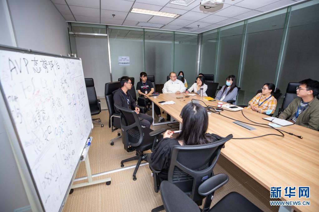 5月27日,在重庆两江新区长安全球研发中心的一间会议室内,万凯林(左四)和团队成员在进行技术研讨。