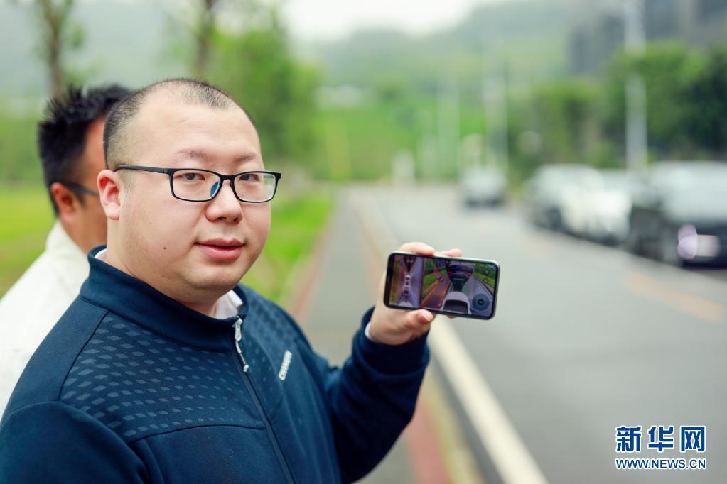 5月27日,在重庆两江新区长安汽车全球研发中心,万凯林展示手机App远程自动泊车系统监控画面。