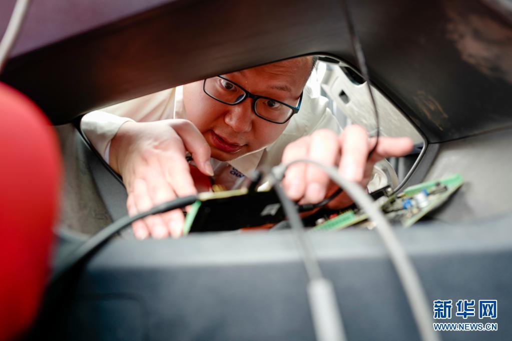 5月27日,在重庆两江新区长安汽车全球研发中心,万凯林检查搭载自动泊车系统的试验车上的数据收集线路和集成处理器设备。