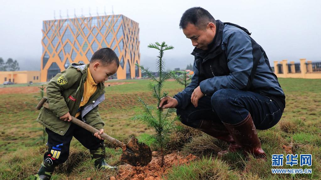 4月11日,在广西融安县西山林场,何振革和孩子一起种杉木。
