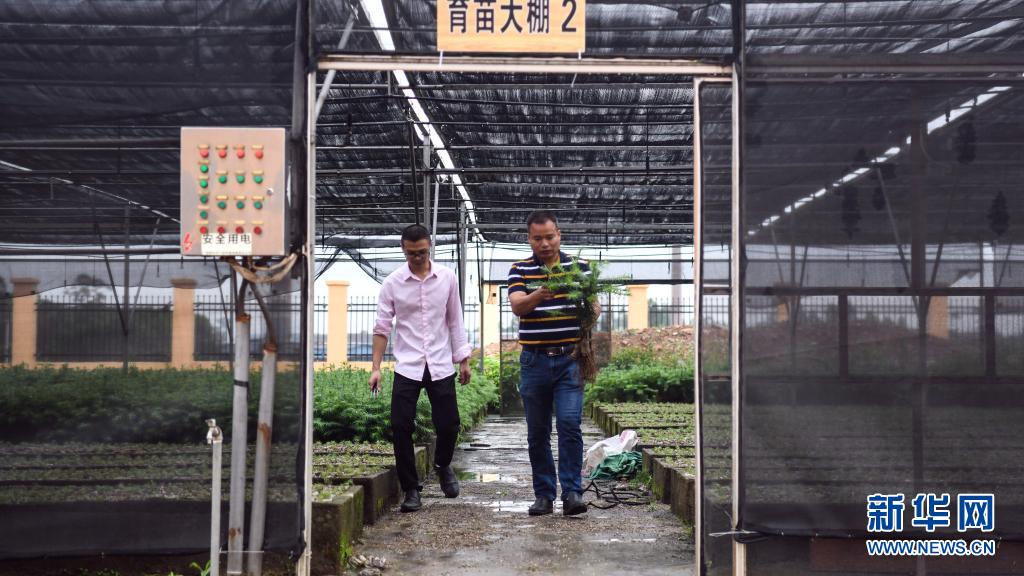 5月27日,在广西融安县西山林场,何振革(右)和团队成员在苗圃园选择杉木良种培育母本。新华社记者 张爱林 摄