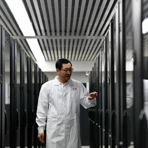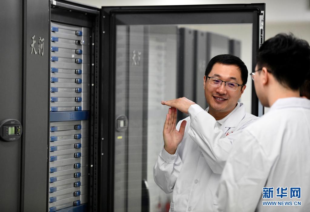 在国家超级计算天津中心“天河一号”机房内,孟祥飞(左)和同事一起巡查(5月27日摄)。新华社记者 赵子硕 摄