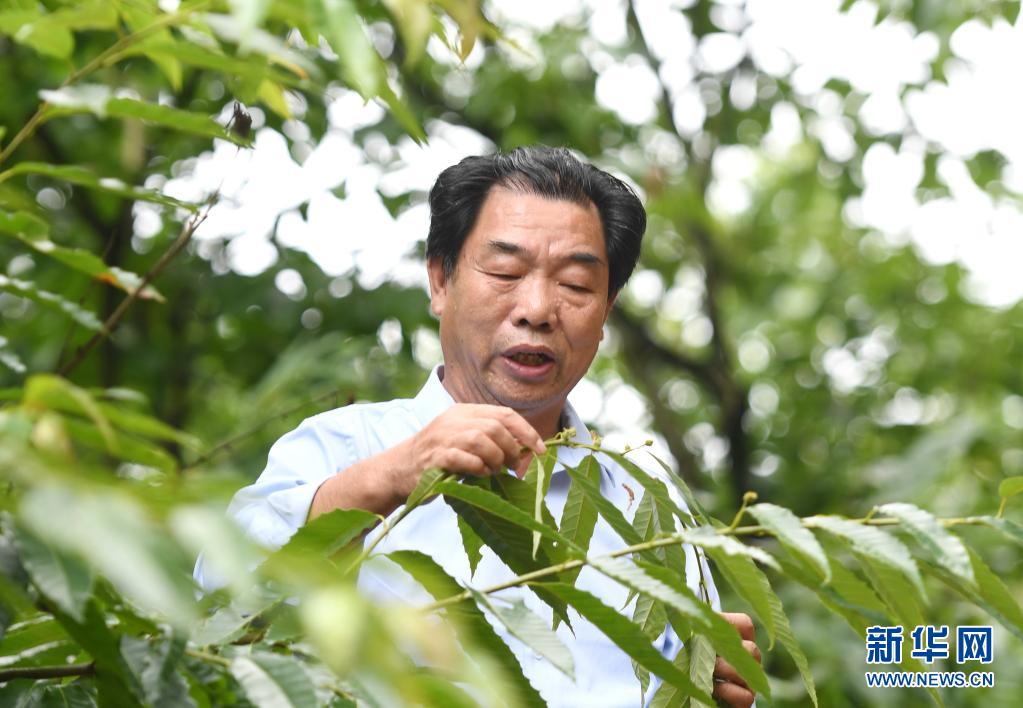 5月28日,人称“黄榛头”的全国优秀科技特派员黄铭利在福建省建瓯市玉山镇上房村的锥栗种植园里查看锥栗生长情况。