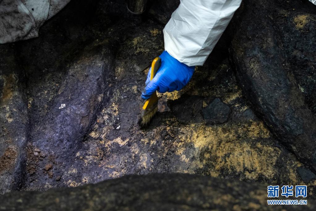 考古人员在四川广汉三星堆遗址四号“祭祀坑”内清理象牙(3月1日摄)。