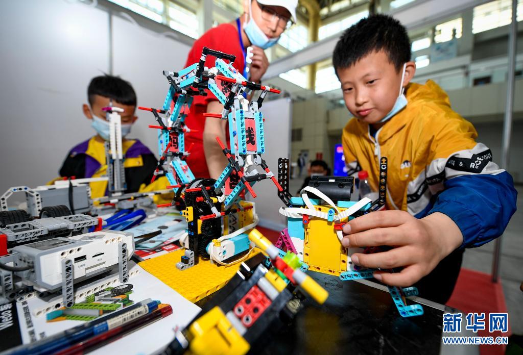 5月29日,小朋友在宁夏科技活动周现场体验机器人模型。