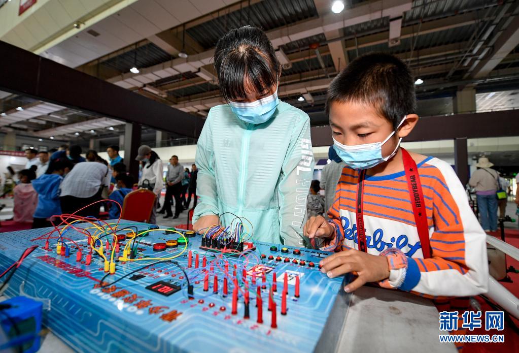 5月29日,小朋友在宁夏科技活动周现场了解电路知识。