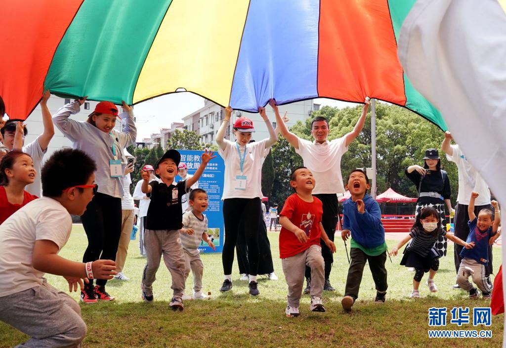5月29日,华东师范大学体育与健康学院师生带领小朋友们参与“降落伞”互动游戏。