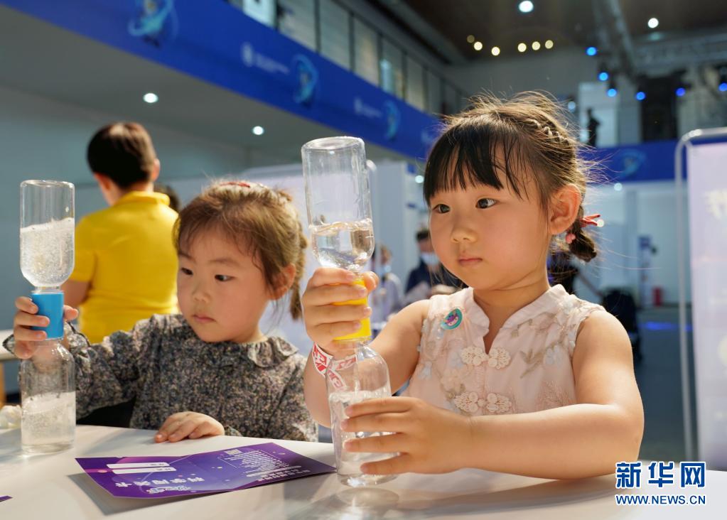 5月29日,在华东师范大学科技园体验区,小朋友参加科学体验项目“双瓶取水”。