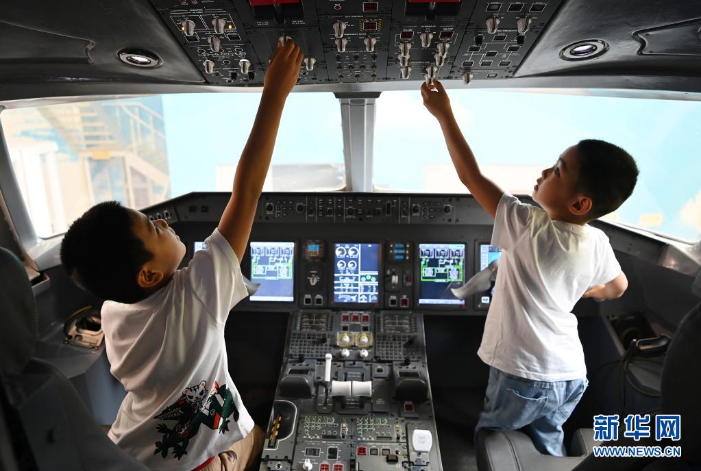 5月29日,小朋友在模拟机舱的驾驶室内体验。