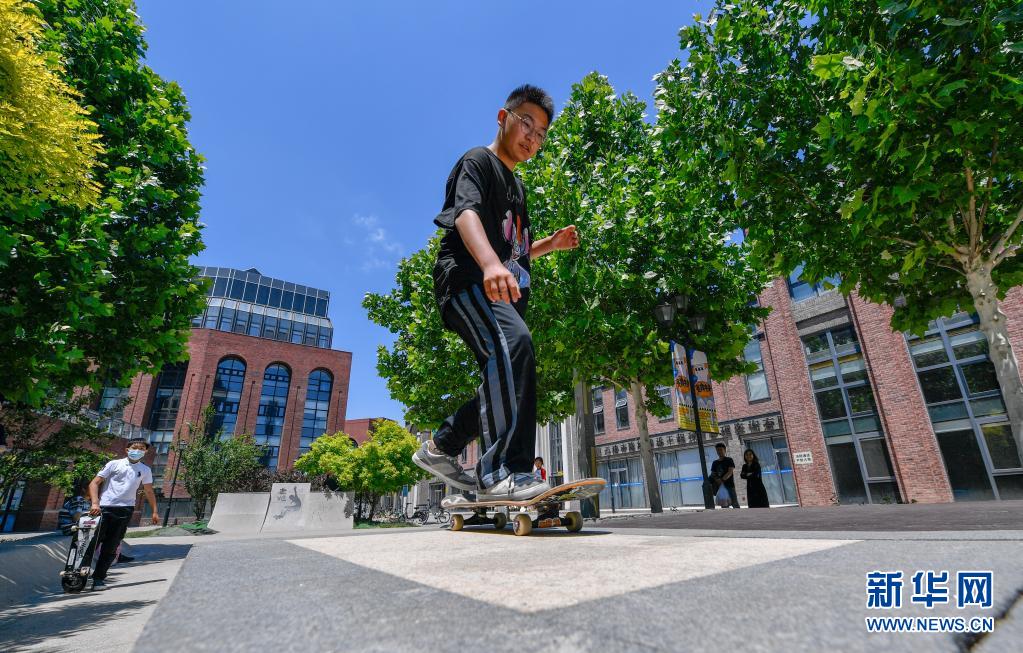 5月29日,滑板爱好者在天津棉3创意街区练习。