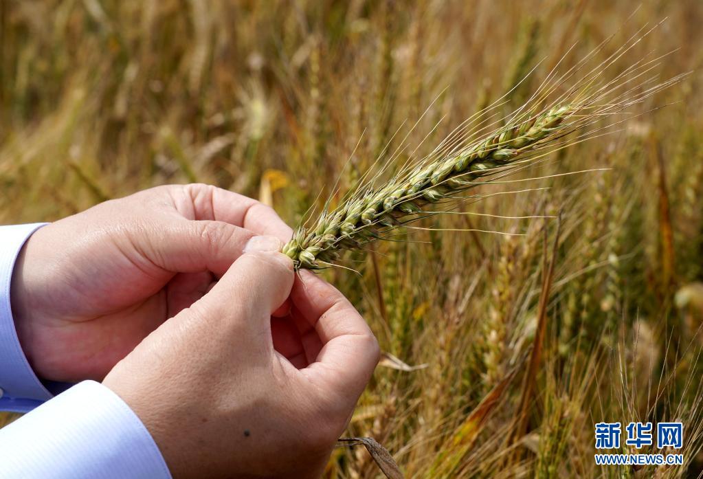 在位于河南省邓州市的国家杂交小麦项目产业化基地的试验田里,赵昌平在进行小麦杂交种穗部性状调查(5月26日摄)。